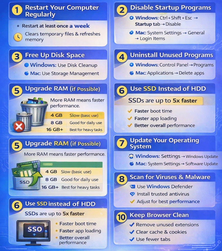 Boosting your computer speed doesn’t always require buying a new device. By cleaning up storage, managing startup apps, updating software, and upgrading hardware like RAM or SSD, you can significantly improve performance.