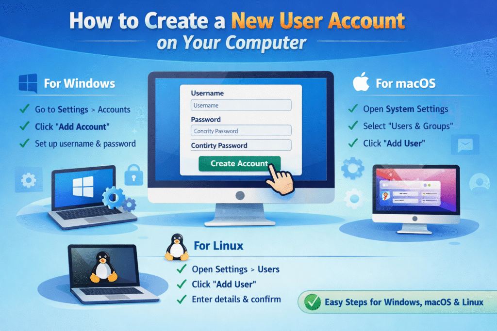 Creating a new user account is pretty simple. Here’s how to do it on the most common systems: